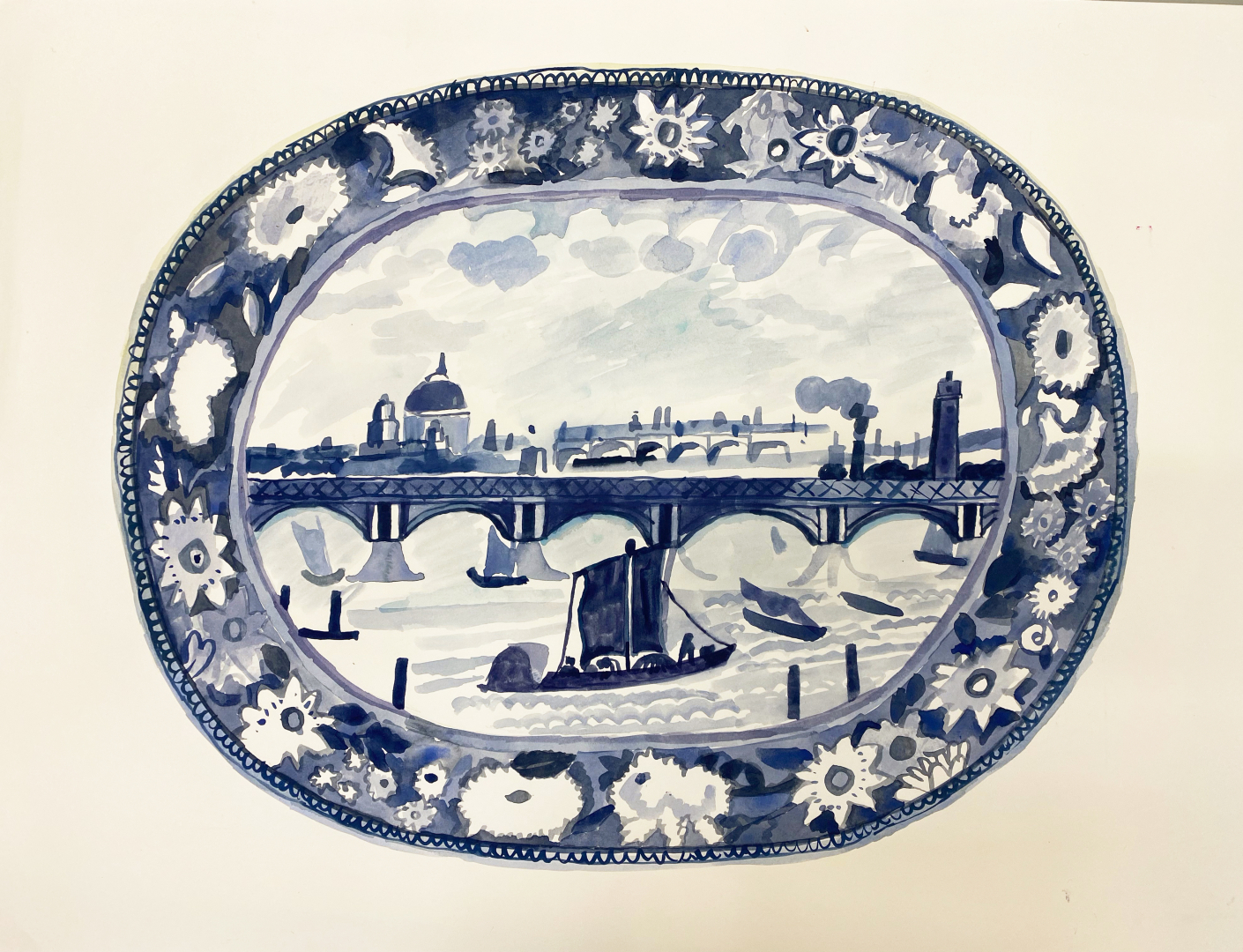 Drawings of blue and white china plates